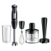 Занурювальний блендер серії MultiQuick 5 Pro. Максимальна потужність двигуна: 1000 Вт. Кількість швидкостей: 25 + турбо режим. Колір чорний. У комплектацію входить: моторний блок із системою EasyClick Plus (Type: HB501BI); металева блендерна ніжка з гострими ножами з нержавіючої сталі, виконана за технологією PowerBel VPlus та SplashControl; насадка подрібнювач на 500 мл; віночок для збивання та перемішування; насадка для приготування пюре; мірна склянка з чіткою мірною шкалою на 600 мл.