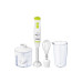 Ручний блендер, живлення 220-240 В 50/60 Гц, потужність 450 Вт, 2 швидкісні режими роботи, TURBO режим, функції: подрібнення, змішування, збиття, ніж з нержавіючої сталі Ice Crush, пластиковий корпус, знімна нога з нержавіючої сталі, чаша з подрібнювачем 500 мл, ручка з петлею для підвішування, аксесуари: віночок, мірна склянка 700 мл.