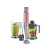 Потужність 1 000 Вт. Виключно тихий двигун постійного струму. Плавне регулювання швидкості (20 швидкостей). Ергономічна ручка. Насадка з нержавіючої сталі, що підходить і для змішування гарячої їжі. Лезо з нержавіючої сталі