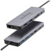 Концентратор USB Type-C 13-в-1 з двома портами HDMI 4K Ultra HD – 30 Гц – Full HD 1080P – 60 Гц, одним портом USB 2.0 з передачею даних 480 Мбіт/с, трьома портами USB 3.0 з передачею даних 5 Гбіт/ с, слотом для картки SDXC і Micro SD з максимальним читанням до 512 Гб, порт USB Type-C підтримує наскрізну зарядку до 100 Вт, аудіороз'єм 3,5 мм, один порт USB Type-C: Data Transfer з передачею даних до 10 Гбіт/ с, порт Ethernet RJ45 та 1920 x 1080P – порт VGA 60 Гц, світлодіодний індикатор робочого стану, алюмінієвий корпус сірого кольору.