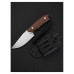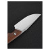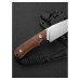 - Клинок з нержавіючої сталі Sandvik 14C28N. Це високоякісна шведська марка з високою корозійною стійкістю та твердістю 58–60 HRC. Метал легкий в обслуговуванні, а сатиновий фініш зберігає естетичний вигляд навіть при активній експлуатації.
